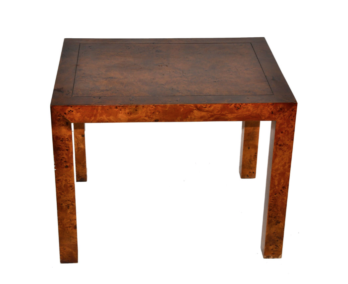 The lovely grain of this burled wood occasional table contrasts beautifully with its clean lines. It would be the perfect table on which to place a lamp next to a sofa.